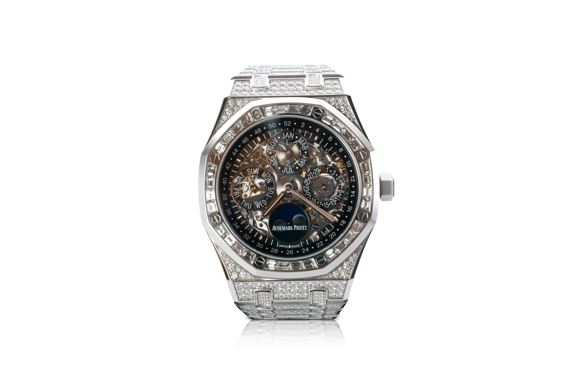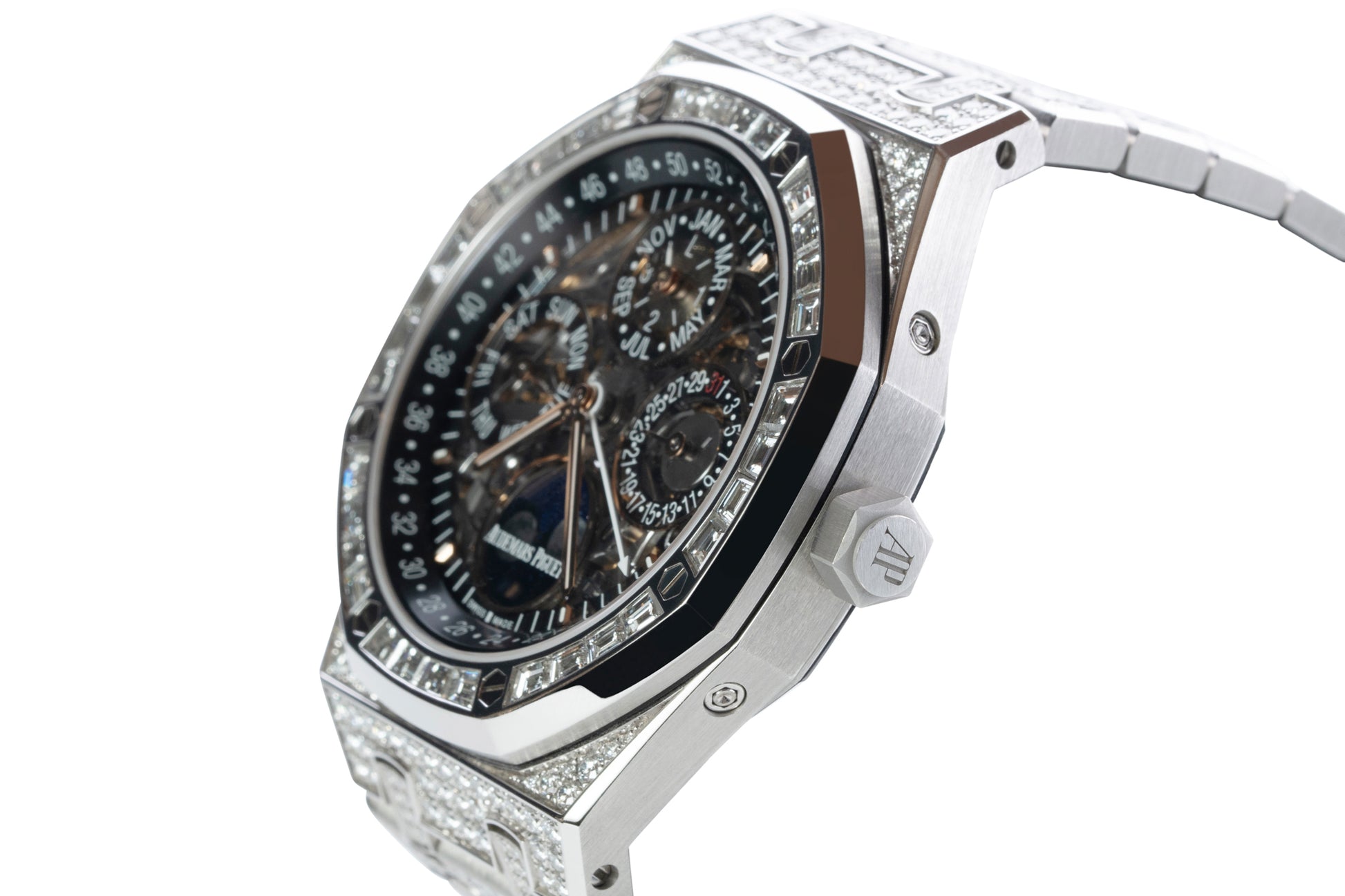 This special edition in white gold is fully set with brilliant-cut diamonds, bringing even more light into the openworked perpetual calendar movement that is visible through a sapphire dial.