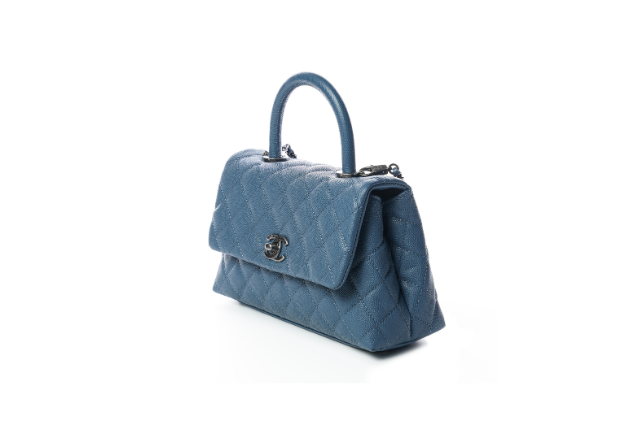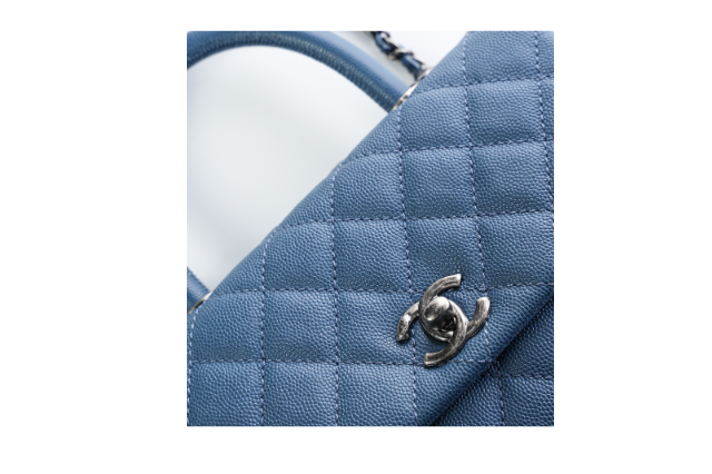 Indulge in luxury with our Caviar Quilted Coco Handle Flap in Blue. This premium handbag boasts hand-stitched quilting and a lizard-embossed finish. The top handle adds sophistication, while the iconic Chanel logo adds a touch of exclusivity. Perfect for the modern-day fashionista.