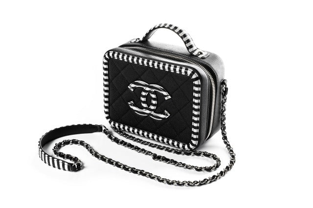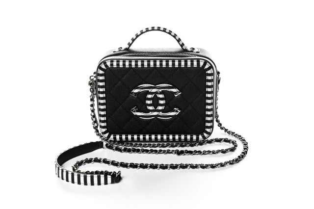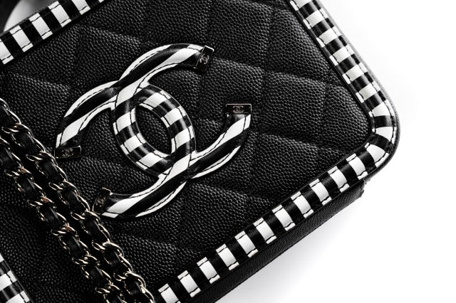 This is an authentic CHANEL Caviar Quilted Striped Medium CC Filigree Vanity Case in Black and White. This chic stylish travel bag is crafted of luxurious diamond quilted caviar leather in black and white. This elegant shoulder bag features silver chain link black leather threaded shoulder strap, a white and black handle and a large Chanel CC stitched logo with silver accents on the front.