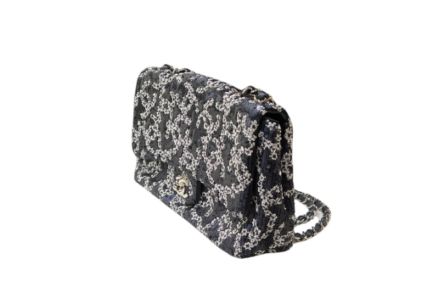 Introducing the Chanel coco Mark sequin CC Flap bag in stunning blue and white. This premium bag features eye-catching sequin details that add a touch of glamour to any outfit. Make a statement and elevate your style with this exclusive and sophisticated piece from Chanel.