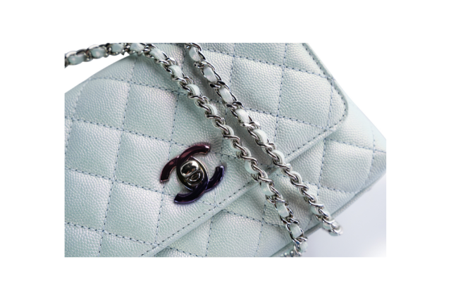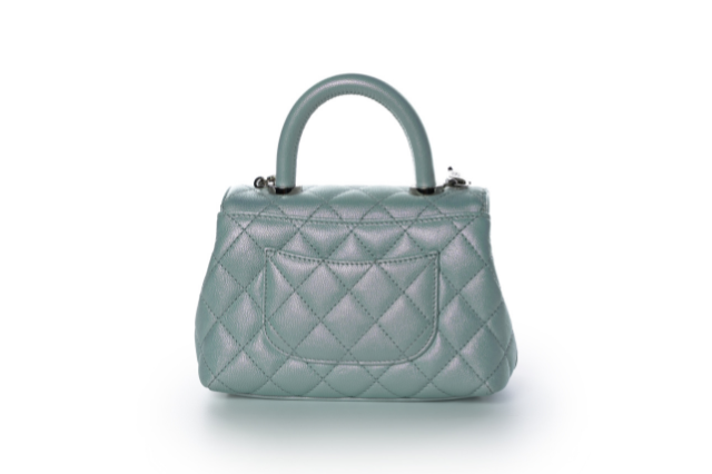 Elevate your style with our Coco Handle Flap Extra Mini. Crafted with premium blue iridescent caviar leather, this Chanel handbag exudes elegance and sophistication. The top handle adds a touch of luxury, making it the perfect accessory for any occasion. Channel the art of fashion with this stunning piece.