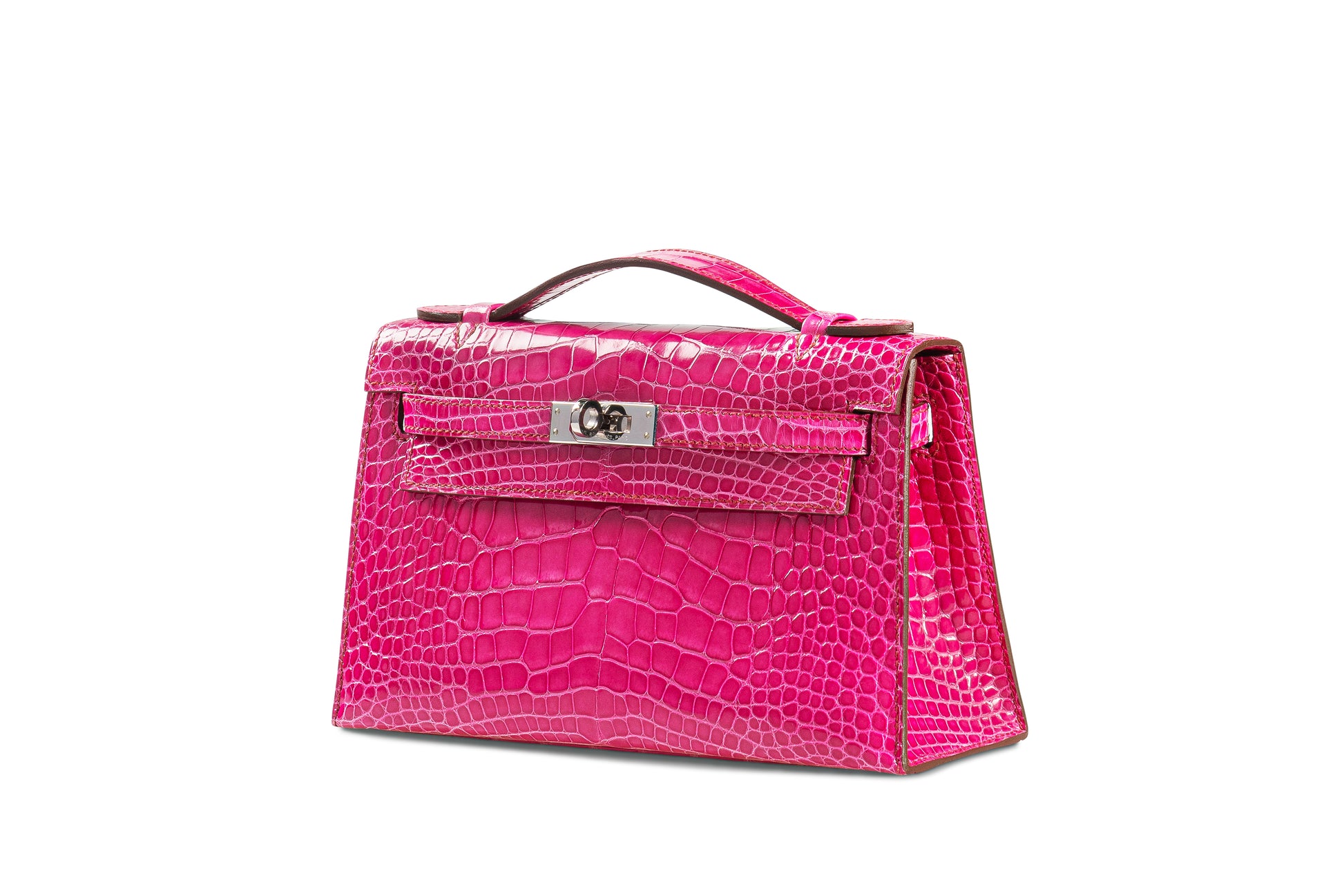The Hermes Kelly Pochette in Alligator and Rose Scheherazade is a chic and stylish choice. The timeless shine enhances the luxurious texture of the exotic leather, while the Palladium hardware adds a touch of elegance.