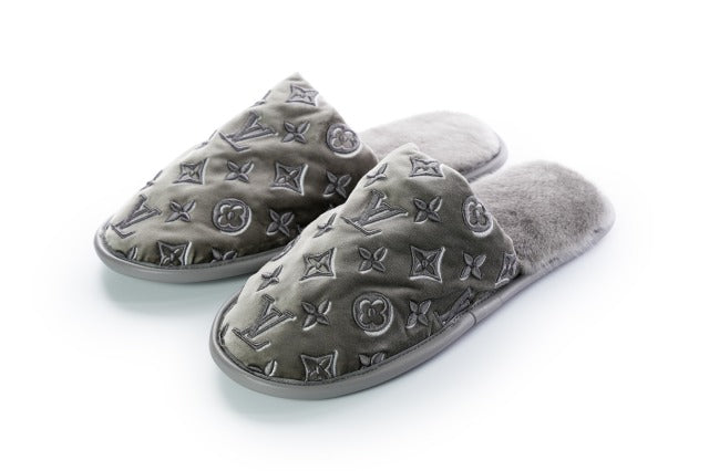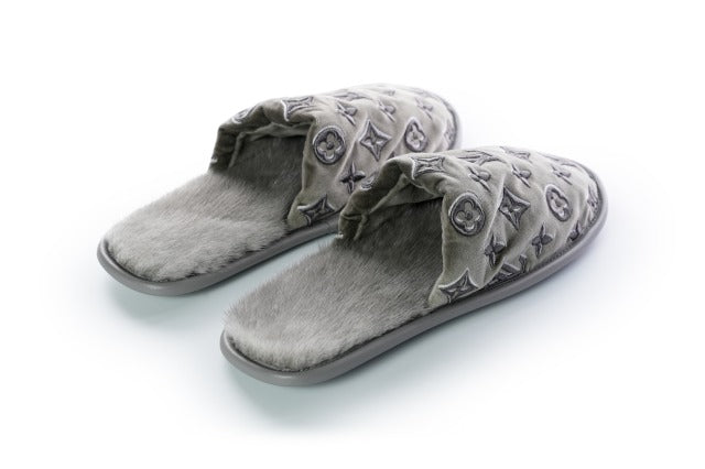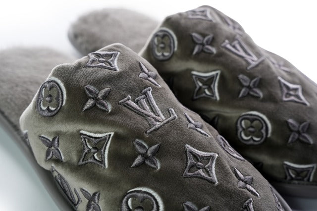 The LV Suite open-back flat loafer comes in soft velvet with Louis Vuitton's iconic Monogram pattern in tonal embroidery. This supple, slip-on style is made even more comfortable by its insock in mink fur. Each pair of slippers is presented with a coordinating velvet pouch.