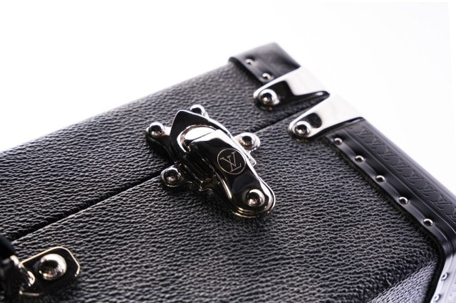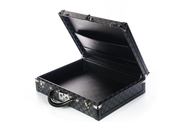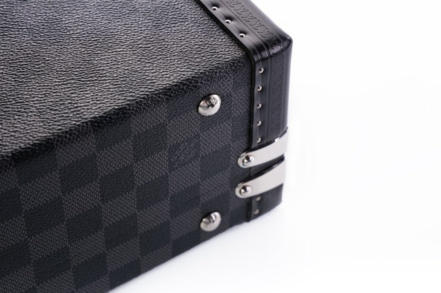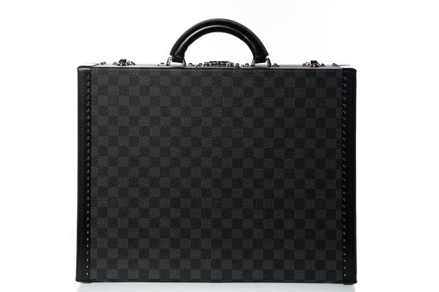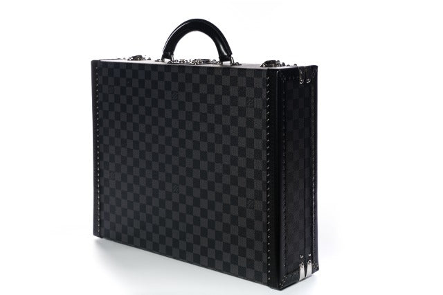 Hard-sided and structured, Louis Vuitton’s Damier Graphite President Briefcase is all business! Made of gray-and-black checkered canvas with black-leather trim and silver hardware, it has a leather top handle with a 2.25-inch drop and a lockable clasp sandwiched between two luggage clasps. Inside you’ll find black grained-leather lining with two slide pockets and two card slots. In very good condition with a dustbag, booklet, luggage tag, clochette, and two keys, it has wear on the corners and edges, scratches on the hardware, scratches and marks inside, and a few small white marks on the canvas. It’s a polished, professional look for fashionable power players!