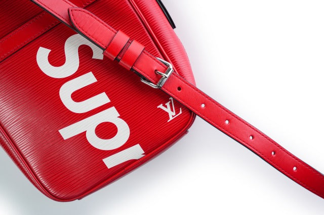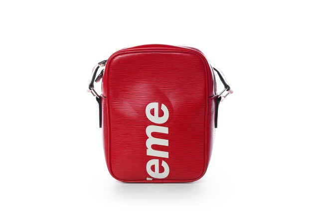 The Louis Vuitton x Supreme Danube PPM in water resistant Epi leather is smaller than the PM but still holds the iconic shape of the classic Louis Vuitton Danube. The Danube, named after Europe’s second longest river features "Supreme" in white Futura Heavy Oblique font. It has has silvertone hardware, a long adjustable canvas strap, black microfiber lining, plus all the style that Supreme has to offer. It comes in an iconic red Epi leather exterior, which was created in 1985 as the fashion brand’s first permanent leather collection. It goes through a special dying process with plant extracts which allows for vivid colors like this redn to shine through. 140 years after Louis Vuitton was founded in Paris, Supreme, called the "coolest streetwear brand in the world right now" by GQ made its debut in New York City. Their highly anticipated collaboration debuted at Paris Men’s Fashion Week in January 2017 and includes clothing, accessories, shoes, trunks and leather goods. The Louis Vuitton x Supreme Danube Epi PPM in red Epi leather is an ideal crossbody bag for day or night.