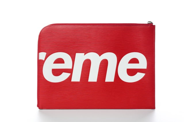 This authentic Louis Vuitton x Supreme Pochette Jour Epi GM Red, which also serves as a laptop case/cover, is the perfect piece for everyday use or travel. The zipper opens smoothly to a black microfiber interior, which has a deep interior pocket for functionality.