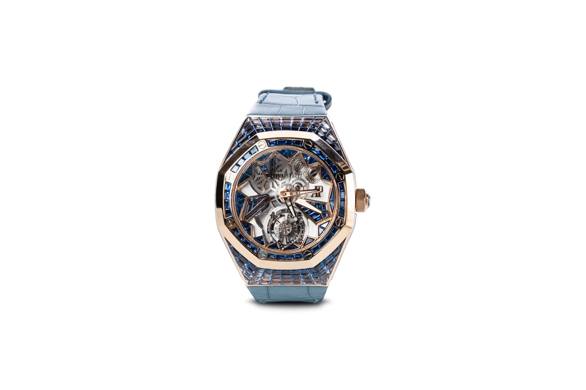 The 18-carat pink gold Royal Oak Concept Flying Tourbillon is invisibly set with 208 baguette-cut sapphires in varying shades of blue and paired with a matching blue strap. This model will be available in select Audemars Piguet points of sale in 2022. |