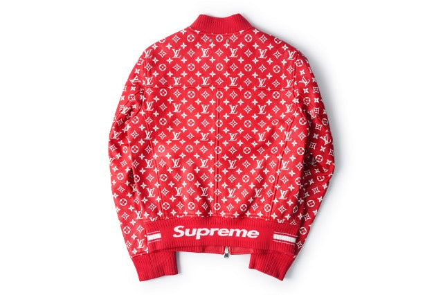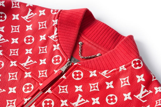The Louis Vuitton x Supreme Leather Monogram Bomber Jacket comes from the Fall 2017 Collection. This vibrant bomber jacket consists of 100% goatskin and cupro, and showcases the signature red of Supreme and the iconic LV monogram. Additionally, the jacket includes a rib knit trimmed collar, dual seam pockets, rib knit trim at the hem, satin chocolate lining and a front zip fastening.