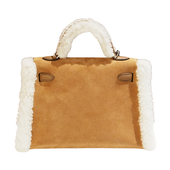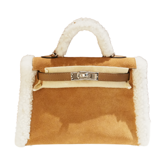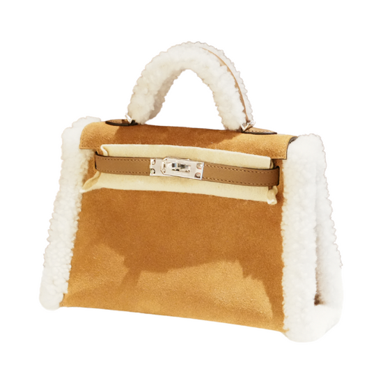 Indulge in luxury with our Hermes Mini Kelly Teddy Grizzly Alezan handbag. Made with soft teddy material, this exclusive bag is perfect for the fashionista who values elegance and sophistication. Get ready to turn heads with the ecru B stamp, a symbol of the highest quality and luxury.