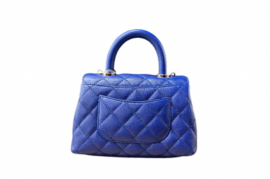 Experience luxury with the Chanel Caviar Quilted Mini Coco Top Handle in vibrant blue. This iconic bag features a top handle for versatile wear and exudes sophistication and style. Made from premium caviar leather and quilted detailing, it is the perfect addition to any fashion-forward wardrobe.